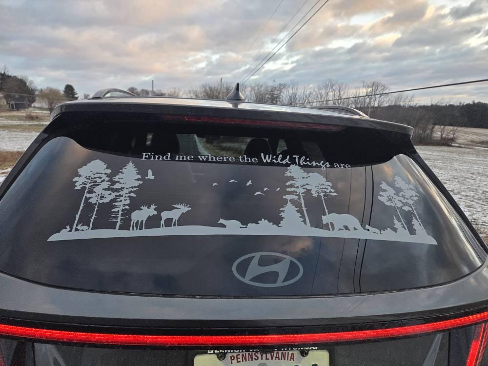 Woodland Landscape vinyl decal sticker. This design includes rabbits, moose, a fox and bears in a wooded landscape. Multiple size and color options available.