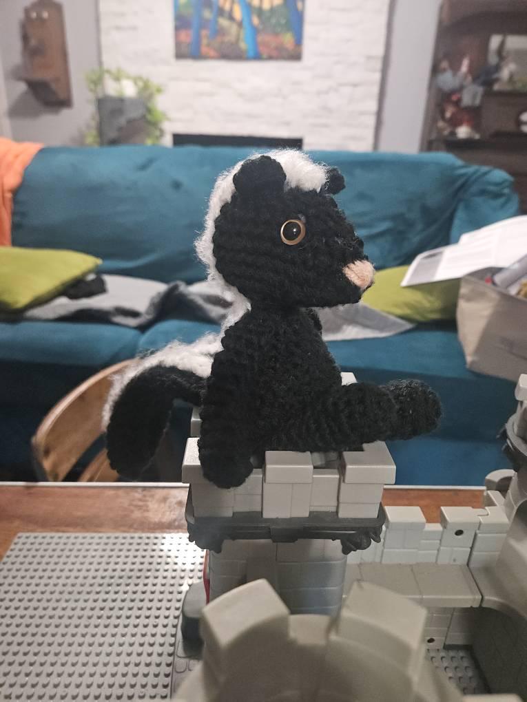 The animals of Critter Hollow are designed to have the least amount of sewing as possible. The skunk has a little more sewing than the other animals because of its stripes. In addition to the stripes the only sewing needed for the skunk are its ears. The body and head are worked in one piece with the tail and arms crocheted in place. Each pattern has written instructions as well as photographs to help with the trickier parts.